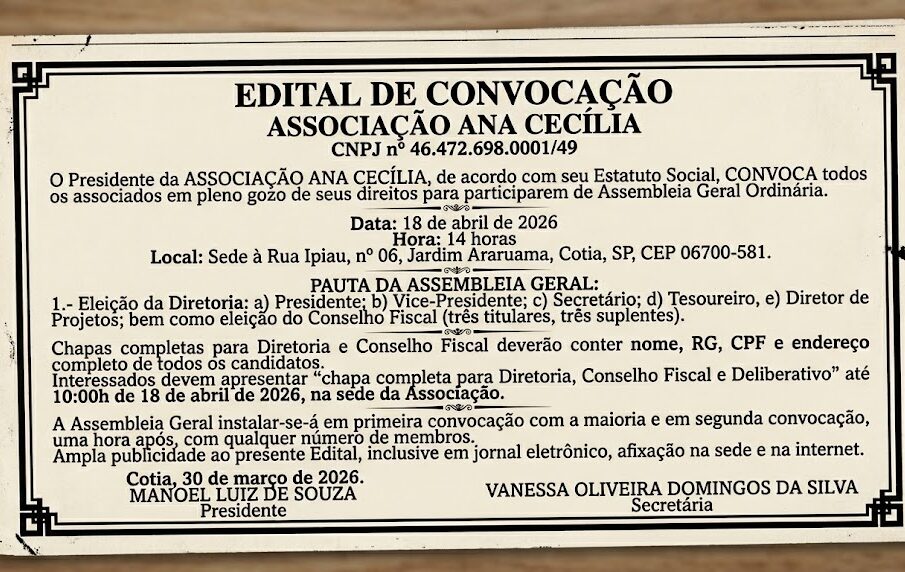 O PRESIDENTE DA ASSOCIAÇÃO ANA CECÍLIA, CNPJ nº 46.472.698.0001/49, de acordo com seu Estatuto Social, CONVOCA todos os associados que estejam em pleno gozo de seus direitos e deveres estatutários para participarem de Assembleia Geral Ordinária que será realizada em 18 de abril de 2026, às 14 horas, em sua sede à Rua Ipiau, nº 06, Jardim Araruama, Cotia, SP, CEP 06700-581.