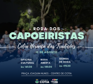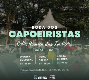 Neste sábado, 12 de agosto, acontece mais uma edição do projeto ‘Roda dos Capoeiristas de Cotia’ na praça Joaquim Nunes, a partir ...COTIA CONQUISTA QUATRO MEDALHAS NA 65ª EDIÇÃO DOS JOGOS REGIONAIS