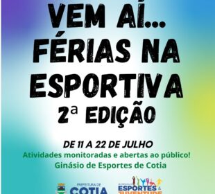 Projeto FÉRIAS NA ESPORTIVA, em sua segunda edição, ocorrerá entre os dias 11 e 22 de julho com atividades gratuitas no Ginásio ...COTIA: CAMPEONATO DE FUTEBOL COMEÇA DIA 9 DE JULHO
