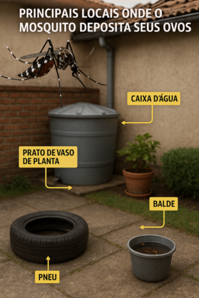 - Descarte: Pneus, garrafas e potes devem ser mantidos cobertos ou virados para baixo. O ovo do mosquito sobrevive até um ano no seco; a fricção com bucha nos recipientes é essencial para eliminá-los.